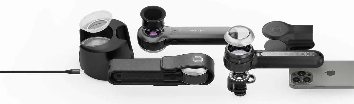 - Dokumentace a měření kožních lézí – díky magnetickému pravítku, retikulu na kontaktní desce a možnosti připojení k chytrému zařízení (telefon/tablet) pro fotografii.